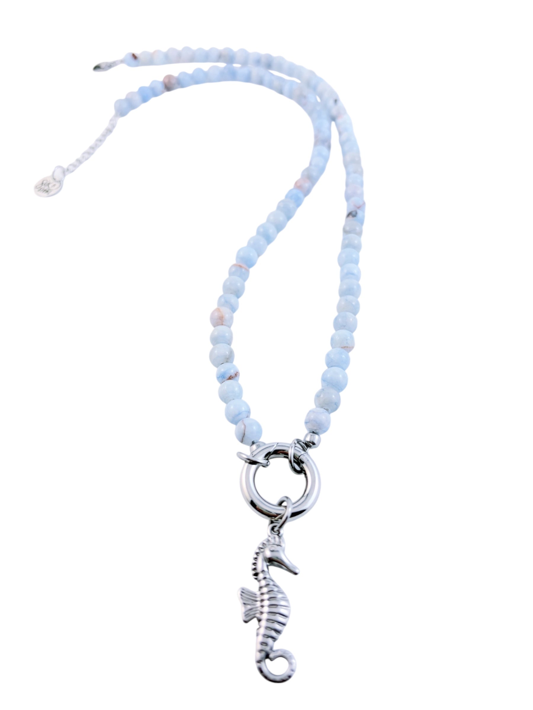 The Blue Lagoon Necklace features soft blue jade beads paired with a beautifully detailed stainless steel seahorse charm. In many cultures, seahorses represent patience, resilience, and quiet strength — a reminder to stay steady and trust the rhythm of the tides.