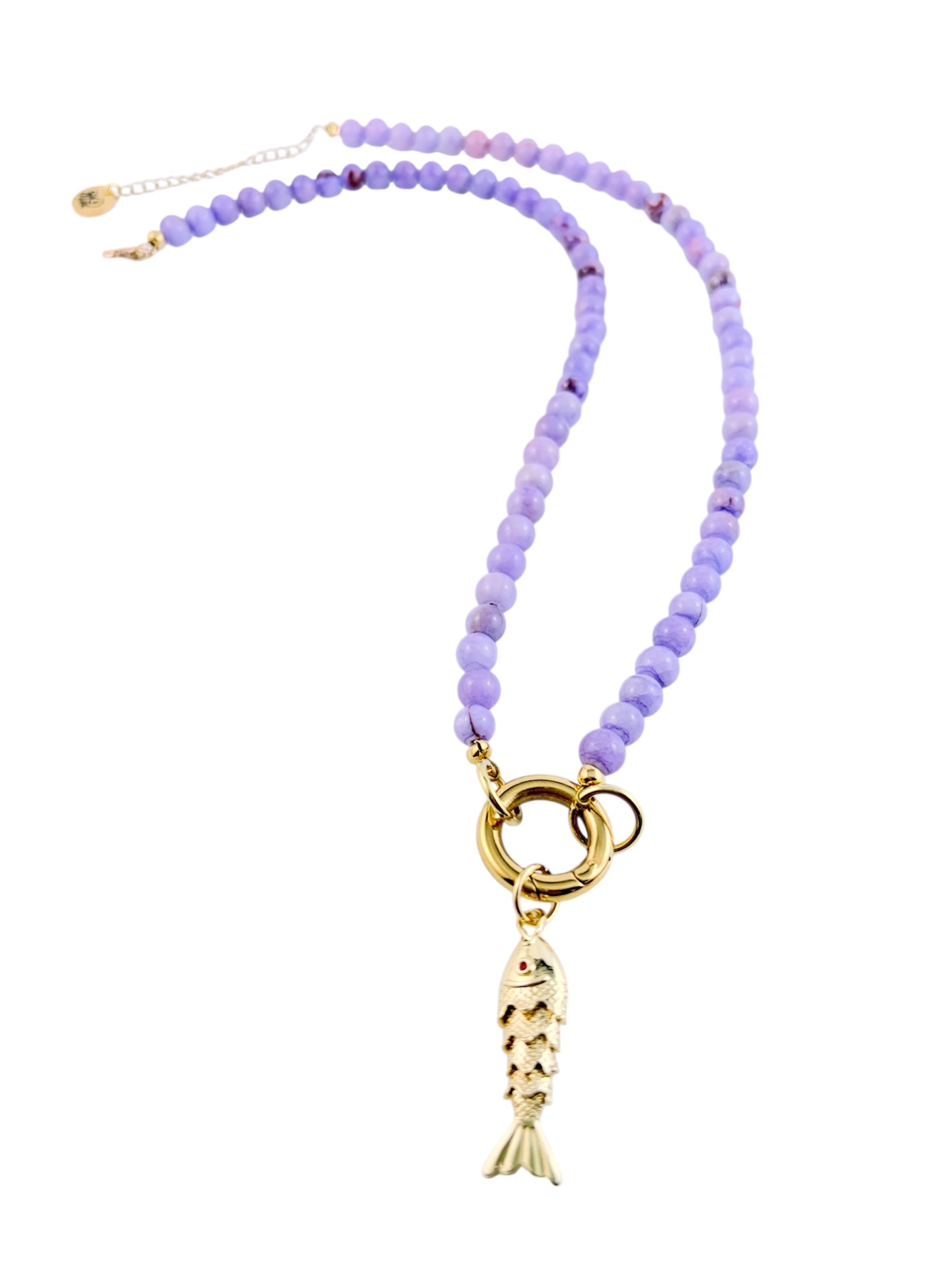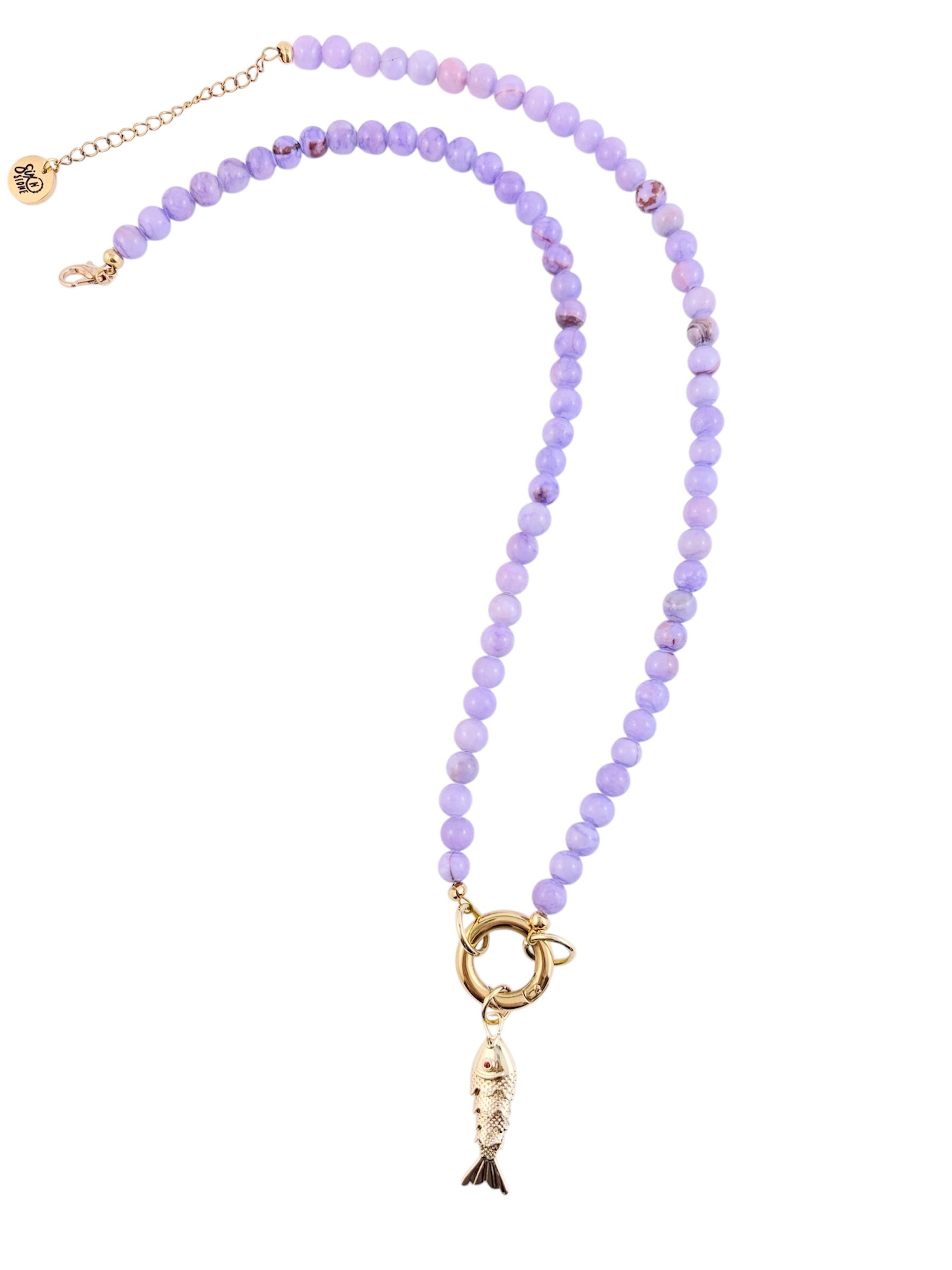 The Lavender Tide Necklace pairs soft lavender jade beads with a beautifully detailed gold fish charm — a symbol of abundance, intuition, and effortless movement through life.